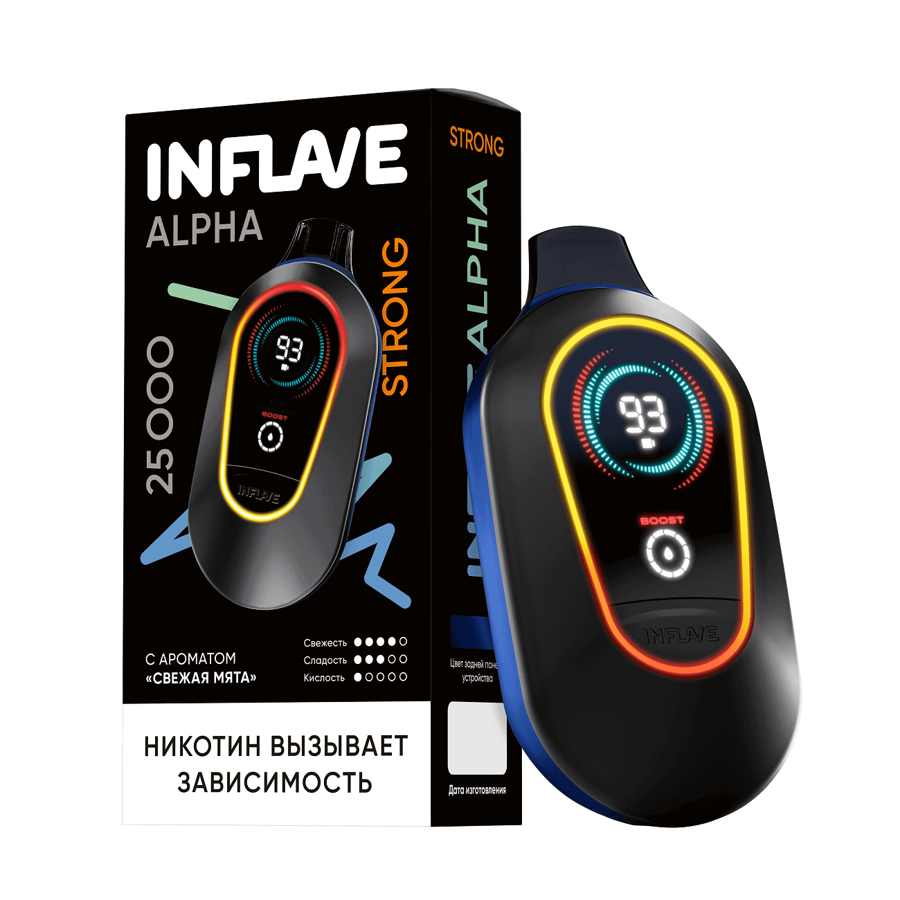 INFLAVE ALPHA 25000 STRONG Свежая мята это одноразовая электронная сигарета нового поколения, где упор сделан на стабильную тягу и понятное управление. Бренд Inflave развивает линейку ALPHA STRONG как современный вейп для активного ритма, с акцентом на ресурс, наглядные индикаторы и быстрый переход между режимами. В серии заявлено 15 вкусов, поэтому легко выбрать профиль под настроение.