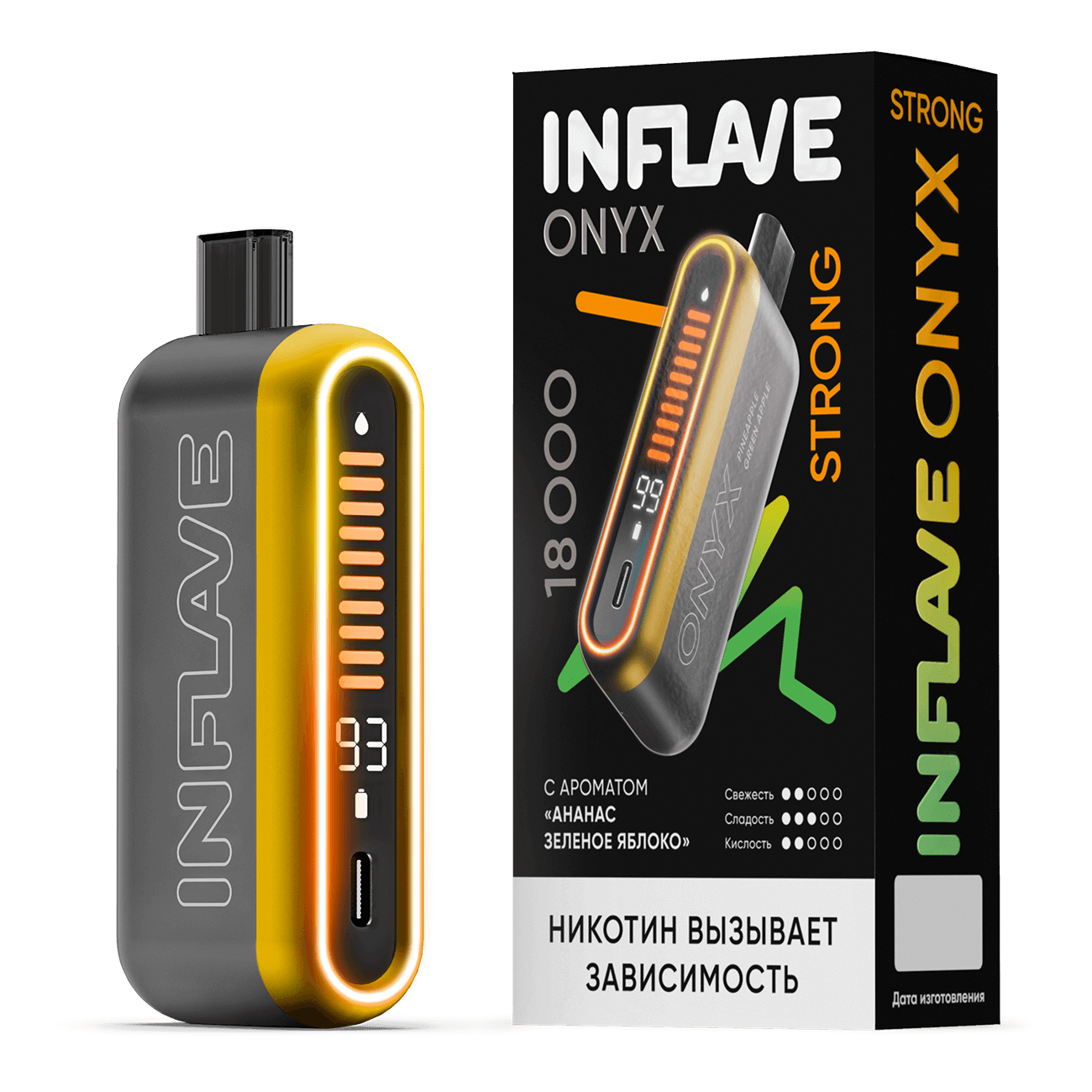 INFLAVE Onyx 18000 STRONG Ананас Зеленое яблоко представляет собой современное решение для тех, кто выбирает одноразовая электронная сигарета с продуманной эргономикой и стабильной работой. Бренд INFLAVE основан в 2020 году и за это время сформировал репутацию производителя, который делает упор на качество сборки и технологичность. Линейка Onyx относится к новому поколению устройств и была представлена в 2024 году как ответ на запрос пользователей на надежный и удобный вейп.