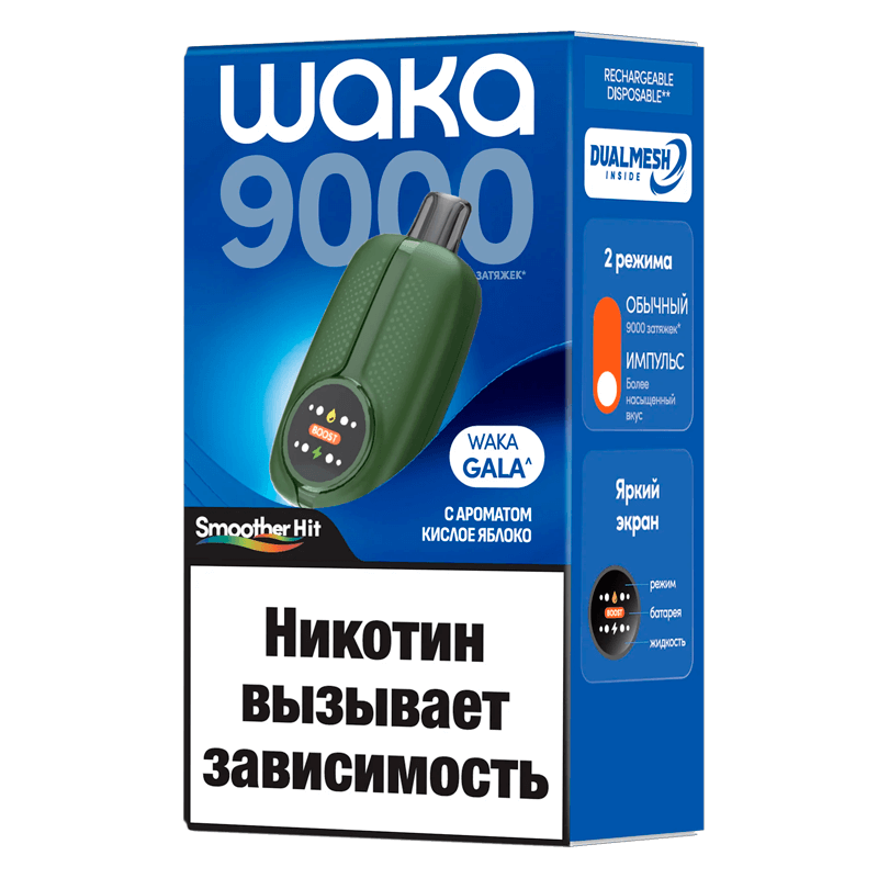 В нашем интернет-магазине есть линейка WAKA Novo Gala 9000, компактный вейп с экраном и двумя режимами. Марка WAKA на рынке с 2021 года и делает упор на понятный интерфейс и аккуратную тягу. Серия относится к новому поколению и создана для тех, кому важен привычный ритм без суеты. На дисплее видно, что происходит прямо сейчас, поэтому легче контролировать режим и заряд без лишних догадок. Корпус ощущается аккуратно, а устройство приятно держать в руке.